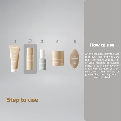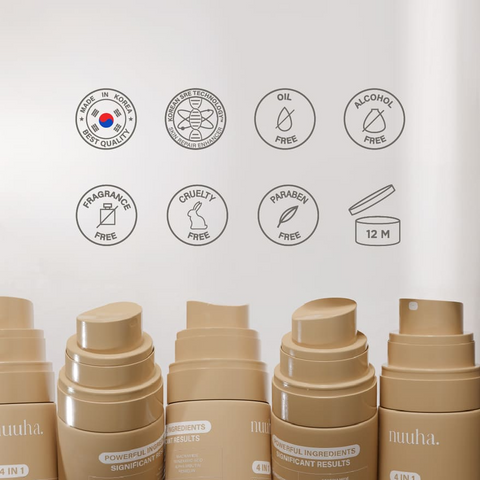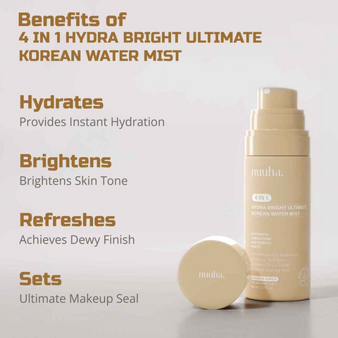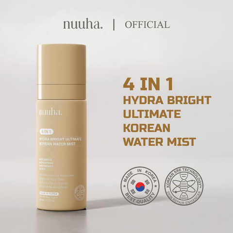 NUUHA BEAUTY 4 IN 1 HYDRA BRIGHT ULTIMATE KOREAN WATER MIST is designed specifically for the ultimate hydration experience. It is a lightweight serum formulated with powerful blends of hydrating and brightening ingredients to effectively provide instant hydration, brighten skin tone, achieve a dewy finish, seal makeup, and ultimately offer long-lasting hydration. The key ingredients are niacinamide, tranexamic acid, alpha arbutin, resmelin, 7x complex hyaluronic acid, panthenol, trehalose, and betaine.