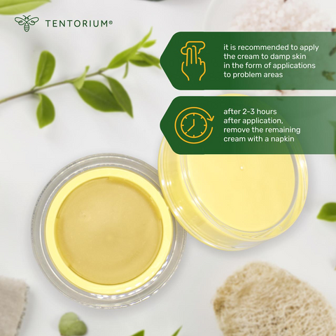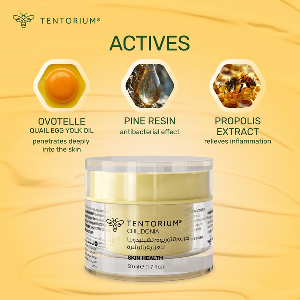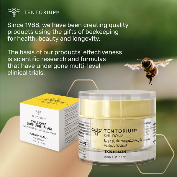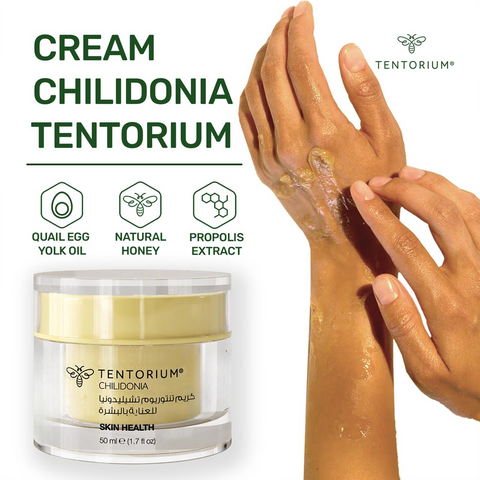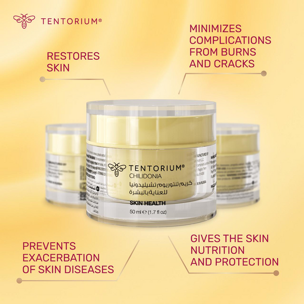 Discover the harmony of nature traditional care and science with Tentorium Chilidonia Skin Health Cream – a universal natural balm crafted with bee products and botanical oils to bring deep comfort, balance, and renewal to your skin.With its unique composition of propolis extract, beeswax, pine resin, sunflower oil, natural honey, and quail egg yolk oil, the cream supports the skin’s natural ability to recover and stay resilient. It provides noticeable relief in areas that often require strong cosmetic treatments, offering a gentle, natural alternative for skin prone to dryness, discomfort, and irritation.Whether it’s everyday care, rough patches, or long-term skin concerns, Tentorium Chilidonia Skin Care Cream helps skin look healthier, calmer, and naturally radiant – without aggressive ingredients.Perfect for use on hands, feet, elbows, or any dry and sensitive areas – a true family essential. Tentorium Chilidonia Skin Health Cream, as an Ointment for Skin Protection and Restoration:- softens and moisturizes the skin;- helps cope with chapped skin- prevents exacerbations of skin diseases;- promotes healing of cracks in the skin.