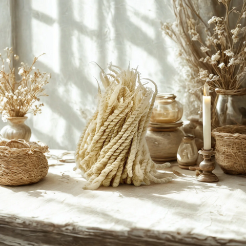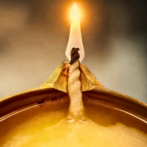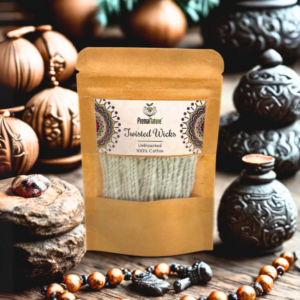 Hand-rolled twisted wicks, crafted from soft, unbleached cotton by skilled rural women.