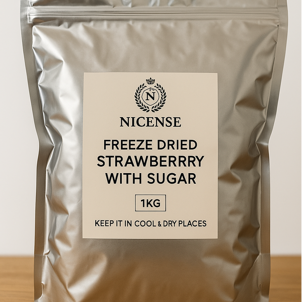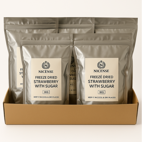 Experience the perfect balance of sweetness and crunch with Nicense Freeze Dried Strawberry With Sugar Premium Quality 1kg Pack x 5. Made from fresh, ripe strawberries, each piece is gently freeze-dried to preserve natural flavor, nutrition, color, and aroma — then lightly coated with sugar to enhance taste and texture.