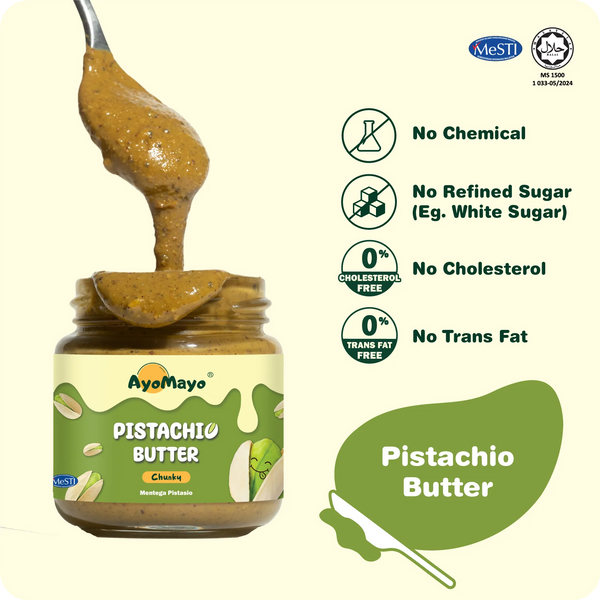 Experience the authentic taste of AyoMayo’s Pistachio Butter, made from 100% USA-sourced pistachios — and no junks. Crafted for true nut lovers, this creamy spread captures the pure, natural essence of top-quality pistachios with pinch of organic molasses and himalayan salt.