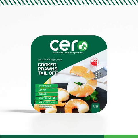 Cero Cooked Prawns Tail-Off are succulent, ready-to-eat prawns made with 100% clean label ingredients. Fully cleaned, with no additives or preservatives, they deliver pure, fresh seafood flavor—perfect for salads, stir-fries, and more.Nutritional Highlights🦐 High in Protein — clean, lean seafood protein🌊 Source of Omega-3 fatty acids — supports heart & brain health💪 Provides Vitamin B12, B3 & Choline — energy & metabolism🛡️ Rich in Selenium, Iodine, Copper & Zinc — immunity & thyroid health✨ Low in Calories — nutrient-dense and light Clean Label Promise• Convenient, ready-to-eat protein• Naturally lean, no added preservatives• Simple & wholesome ingredient list