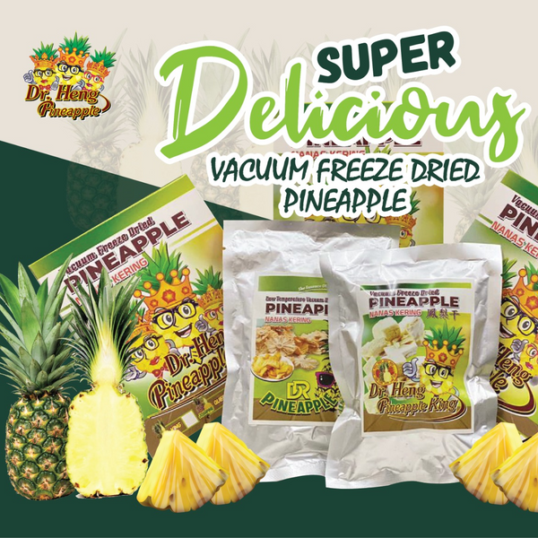 Dr. Heng Vacuum Freeze Dried Pineapple is made from fresh pineapples using advanced vacuum freeze-drying (FD) technology, which gently removes moisture while preserving the fruit’s natural flavor, color, and nutrients. This process ensures a light, crispy texture and a long shelf life without the use of additives or preservatives.