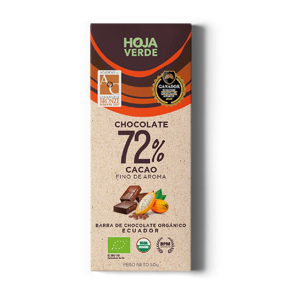 Hoja Verde 72% Cacao – Organic Dark ChocolateExperience the perfect harmony of intensity and smoothness with our 72% Cacao Organic Dark Chocolate.