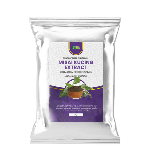 AUTHENTIC STANDARDIZED MISAI KUCING EXTRACTDiuretic • Detoxifying • Scientifically ValidatedOur Authentic Standardized Misai Kucing Extract is derived from Orthosiphon aristatus leaves—traditionally known as “Cat’s Whiskers.” Highly valued in Southeast Asian herbal medicine, Misai Kucing is renowned for its diuretic, anti-inflammatory, kidney-supporting, and blood sugar–modulating properties. Each batch undergoes stringent authentication and is extracted using a clean aqueous method to ensure purity, potency, and quality.