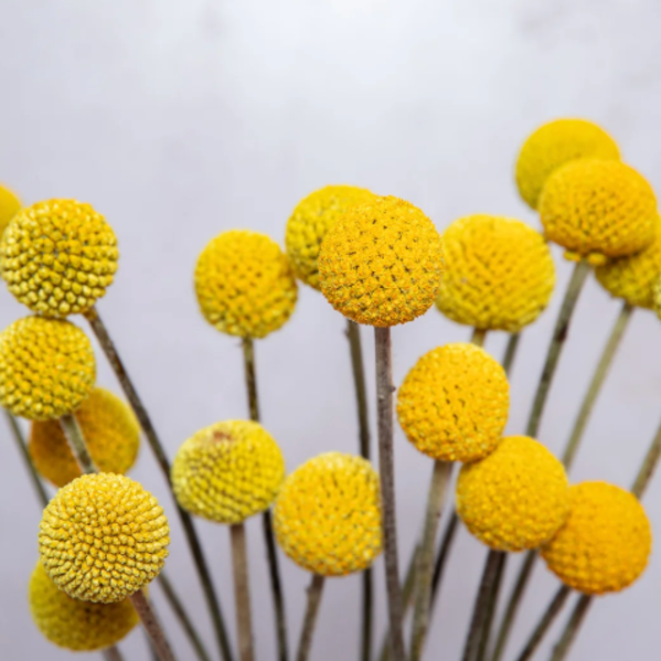Craspedia flowers, also known as Billy Balls or Drumsticks, are known for their unique, spherical, bright yellow flower heads that grow on long, slender stems. These flowers are composed of numerous tiny florets tightly packed together and can be used both fresh and dried. The plant also features a rosette of silvery-green, hairy, lance-shaped leaves at its base.