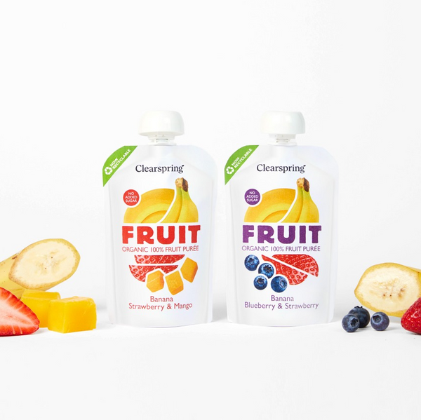 Clearspring Organic FRUIT 100% Fruit Puree offers a naturally sweet and harmonious blend of premium organic bananas, blueberries, and strawberries. Convenient and minimally processed, it is free from added sugars or concentrates and each pouch contributes towards 1 of your 5-a-day. It is perfect for the whole family to enjoy at home or on the go and is now available in recyclable packaging.