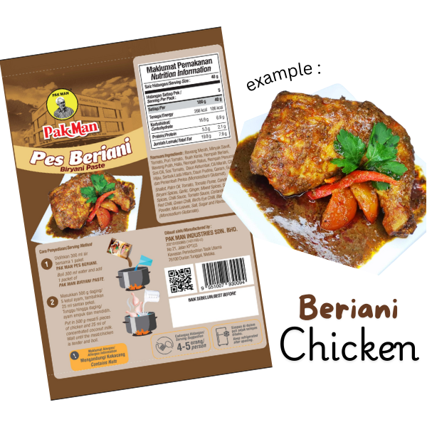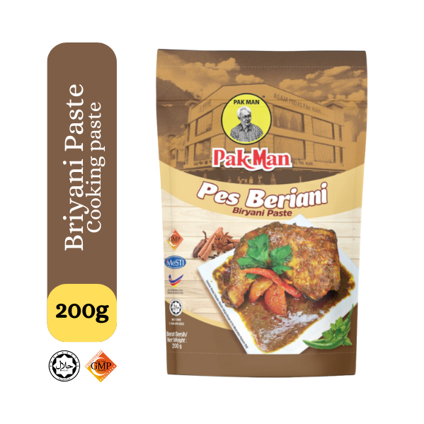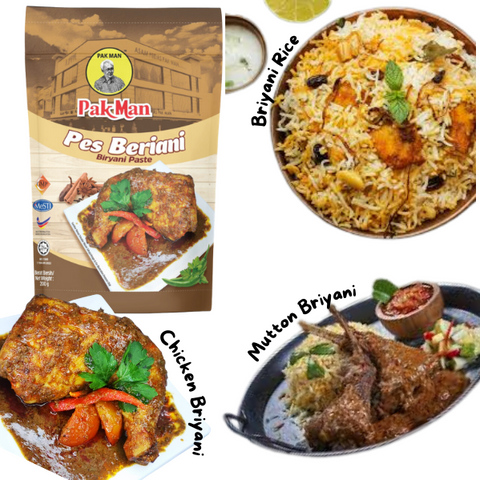 Briyani is mainly popular in South Asia Country. Briyani rice served with Chicken Briyani is a perfect combination of aromatic dish made with fragrant rice, tender meat, and bold spices. Each bite bursts with flavor, blending the warmth of cinnamon, cumin, and cloves. Pak Man Briyani Paste is the ultimate shortcut to creating flavorful Beriani dishes like Briyani rice, Chicken Briyani, and Beef Briyani. Just add water and coconut milk to enjoy rich, aromatic spices with tender meats or rice. It's a deliciously easy way to bring authentic Briyani to your kitchen!