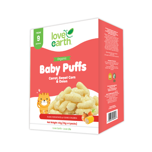 Product Name: Organic baby puffs - Carrot, Tomato, OnionGrams: 40gCarton: 40g x 12Country of Origin: Malaysia