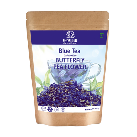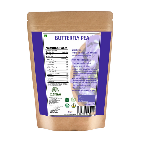 ROOTNRISEBLISS 100% Pure and Natural Butterfly Pea Flower. Sourced from the finest butterfly pea (Clitoria ternatea) blossoms, this vibrant blue flower is naturally rich in antioxidants, flavonoids, and anthocyanins — known to support brain health, improve skin and hair, and promote relaxation. Whether brewed as a soothing herbal tea, added to skincare recipes, or used as a natural food colorant, our butterfly pea flower is free from additives, preservatives, and artificial coloring. Its deep blue hue transforms beautifully when mixed with lemon or other acidic ingredients, making it both a healthful and eye-catching addition to your daily routine. Naturally caffeine-free and 100% vegan, it’s a perfect way to add wellness and color to your life — the way nature intended.