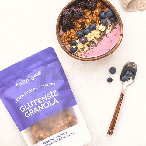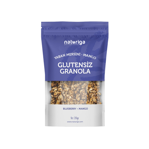 We are here to accompany your meals with delicious blueberry and mango granola with rich nuts.Our GLUTEN-FREE granola, baked at low temperatures (below 120 degrees), does not contain refined sugar and also contains nutritious ingredients such as banana puree, coconut flakes and almonds. It's like a crunchy biscuit taste. You can consume it directly as a snack, add it to milk, plant-based milk and yoghurt, sprinkle on to desserts, ice cream and puddings, decorate pastries and even sprinkle it on your salads for a sweet-salty flavor.