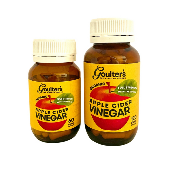 Available in 60 and 120 capsule glass jars. Ingredients - Goulter’s Organic ACV 71%, Organic Maltodextrin 29%, Organic Acetic Acid 9% Benefits Apple Cider Vinegar has long been valued for its wide range of health benefits -