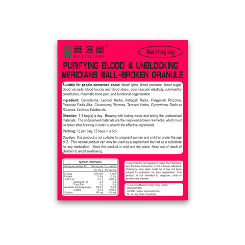 Suitable for people concerned about: blood lipids, blood pressure, blood sugar, blood viscosity, blood toxicity and blood stasis, poor vascular elasticity, sub-healthy constitution, rheumatic bone pain, and functional degeneration.Purifying Blood & Unblocking Meridians Wall-Broken Granule strengths your body's self-healing capabilities by activiting your body cells.