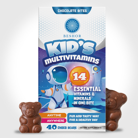 BESHOR Chocolate Bears are a fun and tasty way to begin Kid’s mornings. These treats are intended to energize and nourish young minds and bodies as their days get underway. Nourish your child's health and growth14 essential Nutrients Support Bone and Teeth HealthExcellent source of vit D3 Support Healthy Brain & Nervous SystemComprehensive Vit B complex ( B1, B2,B3,B4,B5,B6,B7,B9,B12) Support Immune Health( Vit D3, C, E, selenium, and Zinc) Support Eye & skin Health( high source of antioxidants Vit A, C, and E)