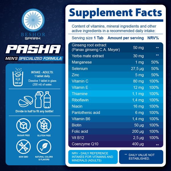 Men’s Specialized FormulaGinseng+ Yerba + Q1013 Vitamins & Minerals100% NRV of 10 essential vitaminsNo Added SugarLow Calories20 Effervescent TabletsBlackberry & Orange Flavors